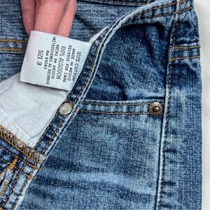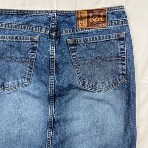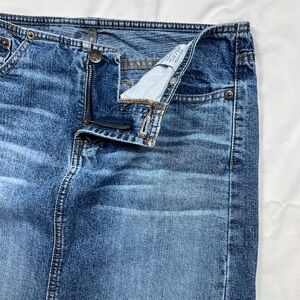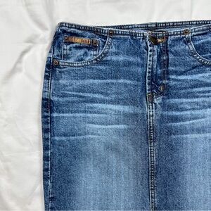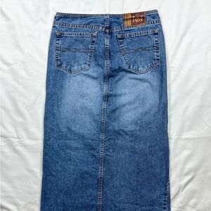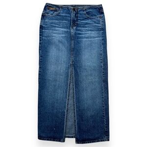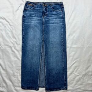 low waisted “L.e.i” dark stone wash denim maxi skirt with a slit down the front