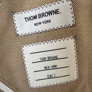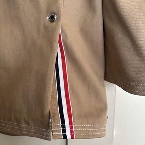 Brand new never worn Thom Browne unconstructed coat in tan. Features metal button details, red white and blue stripe accents. Purchased online as a final sale and couldn’t return it when I didn’t like how it fit me. Measurements are as shown in photos.