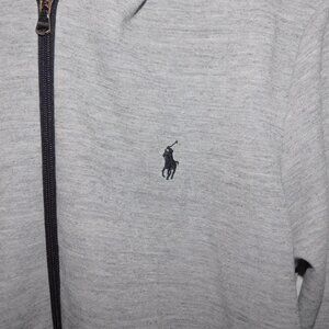This Men's Medium Polo Ralph Lauren Light Heathered Gray Black Pony Performance Full Zip Hoodie is in great clean bright condition ** The hood drawstring has been removed. Hoodie is 58% Polyester - 42% Cotton - machine washable. Features split kangaroo Pocket.