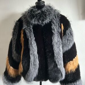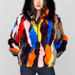 Elevate your style with this luxurious multicolor fox fur coat. Featuring vibrant red, blue, and pink hues, this piece adds a bold statement to any outfit. Perfect for a chic and sophisticated look.