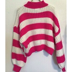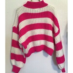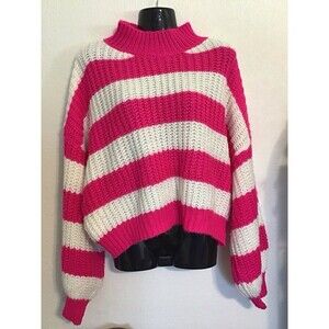 This Adora sweater is a must-have for any fashion-forward woman. The striped design in pink and white adds a touch of femininity to any outfit, while the turtleneck and long sleeves make it perfect for colder weather. Made from high-quality acrylic material, this sweater is both comfortable and durable. The pullover style and regular size type make it easy to wear and fit, respectively. Ideal for women of all ages and sizes, this sweater is a great addition to any wardrobe. in excellent condition.