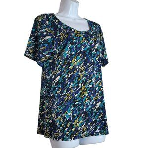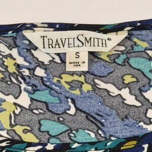 Women's Travel Smith Top Blue, Tan, Black, White Abstract Print Round Scoop Neck Short Sleeve Light Weight 95% Polyester, 5% Spandex Machine Wash / Tumble Dry Made in the USA Women's Size Small, See photos for measurements Pre-Owned Excellent Condition