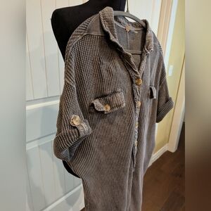 Free People One oversized gray waffle knit romper with a textured design and contrast fabric accents. Features button down , button pockets and button tabs at sleeve.