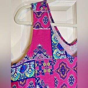 Relaxed, easy silhouette. V-neck. Side pockets. Side slits at hem. Longer length for added coverage and comfort. Sizing, measurements and fabric below. Like new condition. Smoke free.