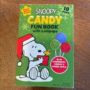 "Holiday Snoopy Candy Fun Book with Lollipops," featuring the Peanuts characters.