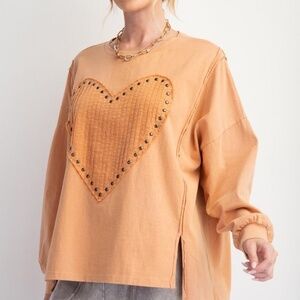 New Easel Studded Heart Patch Long Sleeve Knit Top Pullover Sweatshirt Apricot
