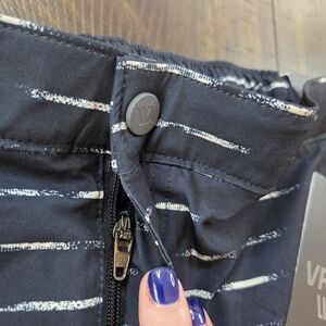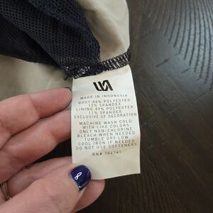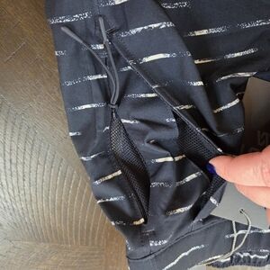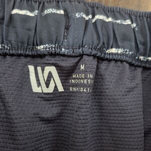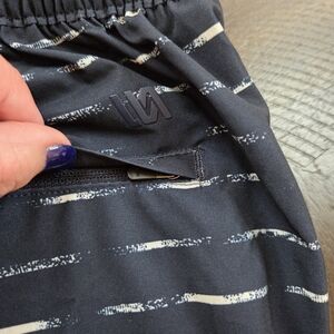 Elevate your warm-weather wardrobe with these stylish and functional VRST men's shorts. Designed for both in and out of water activities, these slim-fit shorts feature a modern navy and sand washed stripe pattern. They are crafted from a quick-dry, durable blend of 88% polyester and 12% spandex for ultimate comfort and flexibility. The shorts include a convenient boxer brief liner (89% polyester, 11% spandex) for added support. Details include a zippered back pocket and a side pocket with a zipper, and two hand pockets, perfect for securing small essentials. These shorts are a size men's medium with a 5" inseam. They're a versatile choice for your next resort trip, beach day, or casual outing.