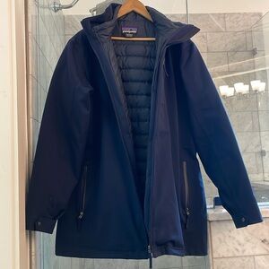 Excellent Used Condition. Includes waterproof/breathable shell and insulated jacket in New Navy color size L. Can be worn three different ways: Standalone waterproof/breathable shell, standalone insulated jacket, or together as an insulated parka.