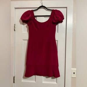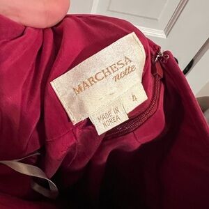 DESCRIPTION: Timeless elegance. Beautiful Marchesa Notte dress with ruffled bottom. 100% silk both exterior and lining! The sparkles on the puff sleeves adds a delicate yet sparkly touch! Hook eye with zipper closure. Hook eye thread could be restitched for better hold. Only flaw is on back, bum area of dress, threading loose but still intact.