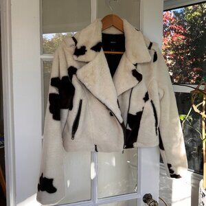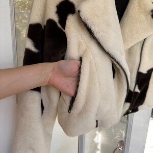 The cutest dang jacket with a playful cow pattern and stylish cut. The material is super soft and mink-y, which makes it chic enough to dress up with a party dress and heels, or just thrown on with a tee and jeans. I wore this with a lemongrass dress to a ranch wedding and got a ton of compliments! Only worn one or two other times, no flaws or signs of wear, zippers work smoothly. Faux leather accents on shoulders and as stabilizer under collar. Color is a creamy off white with dark brown spots (lay flat photos make it look much more yellow-y than IRL).