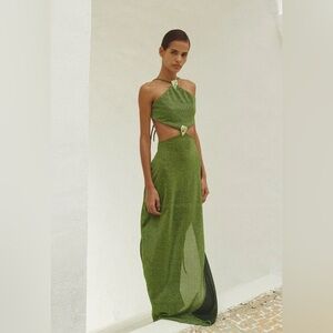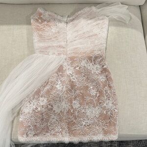 This chic strapless dress features a stunning white lace design, perfect for elegant occasions. The flowing fabric adds a touch of sophistication.