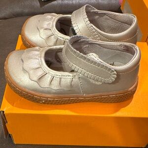 Elegant metallic shoes with a ruffled design. Secure strap for easy wear. Ideal for special occasions.