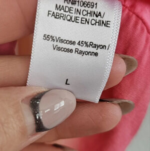 55% viscose, 45% rayon. Made in China, Machine wash. Back tie closure. Adjustable shoulder straps. Sheen satin finish.
