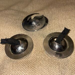 Set of silver finger cymbals with black elastic bands. Perfect for dance or music practice.
