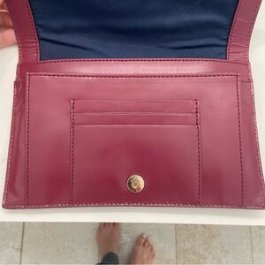 Soft leather. Zip Pocket and card slips inside. Exterior open compartment. Additional change pouch. Gold tone detail. Small “scuff” (shown in photo) on the bottom left of change purse. Excellent condition. #colehaan #quietluxury #cabernetclutch #boho