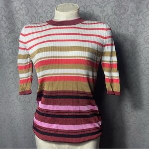 The top features a multi-color striped, ribbed knit design with 3/4 sleeves and a crew neckline.