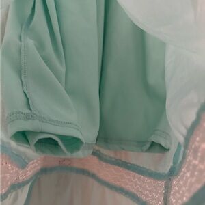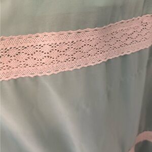 Elegant maxi dress by Flying Tomato. Features aqua skirt with pink and white chevron bodice. Delicate lace accents.
