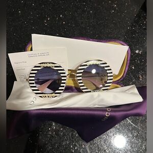 Gucci GG0113S 008 Sunglasses Women's Black+White Striped-Gold/Blue Gradient Lens
