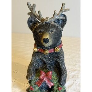 Add a festive rustic touch to your holiday decorating with this charming 8 inch Christmas bear figurine. Dressed in a jingle bell collar and whimsical antler headband, this bear holds a holiday wreath tied with a red bow, making it perfect for woodland, cabin, or farmhouse Christmas themes.