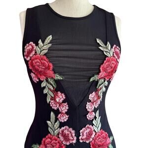 Iris Brand Sheath Bodycon Black Sleeveless Dress with Floral decoration down the front. Dress also has a sheer insert over chest allowing for a sexy cleavage look should you desire. Form fitting fabric has some stretch.