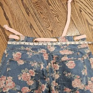 Stylish denim distressed pants featuring a floral pattern with pink accents. Perfect for a casual look.
