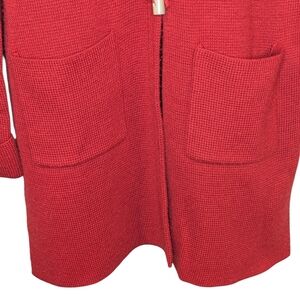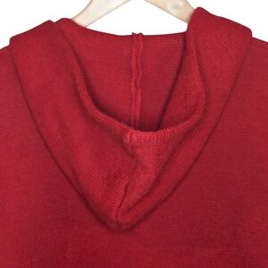 Vintage longline knit cardigan in a bold red color. Features a hood, toggle button closures, front patch pockets, and side vents for an easy, relaxed fit. Soft wool-blend texture with light natural fuzz typical of knits — no stains, holes, or major flaws. Classic Hong Kong–made quality.
