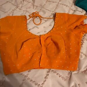 Elegant orange saree featuring a striking blue border. I wore this to a Diwali party.