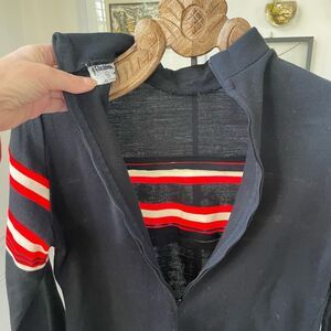 70s Fire Islander mock neck knit top with back zip made of 100% acrylic. Black with ivory and red stripe across the front and wrapped around each arm. Laying flat measures 26 inches shoulder to hem and 19 inches armpit to armpit. Tag size 11/12 based on the measurements it’s like a modern medium. Please double check measurements to ensure the proper fit for you. no noted flaws.