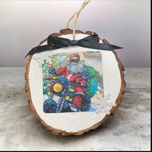 Celebrate the holidays with this unique Santa Claus motorcycle ornament. Featuring a vibrant design, it's perfect for adding a festive touch to your home decor.