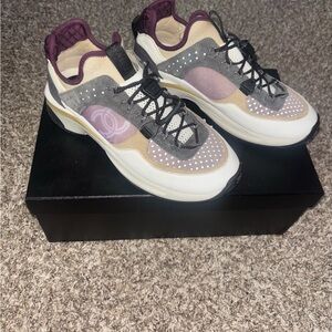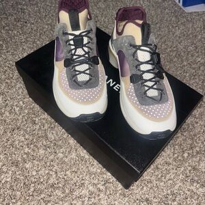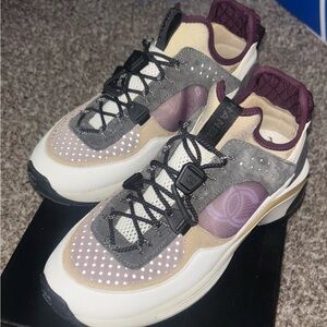 Elegant CHANEL sneakers with a blend of gray and cream. Stylish and comfortable for everyday wear.