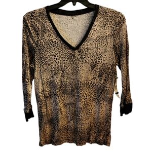 Jones New York Sport animal print blouse, size XL, new with tags. The blouse is 100% cotton, machine washable, and multicolored in brown and black. Features 3/4 sleeves and a V-neck. Soft, stretchy, and smooth feeling for a casual style.