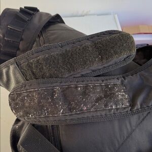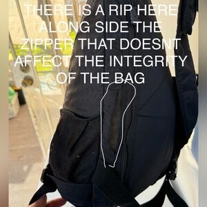 Along the side, the canvas has a tear that does not affect the integrity of the bag.