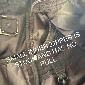 One small zipper inside has a stuck zipper and the zipper pull is missing from it.