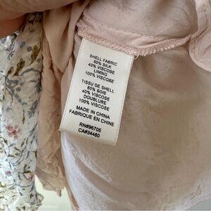 Silk ruffled dress in sheer floral print. 3/4 sleeves. Measures 18” UA to UA, 33” length shoulder to hem