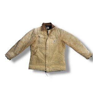 Classic denim jacket with warm sherpa lining. Features buttoned chest pockets and a cozy collar. Ideal for layering in cooler weather.