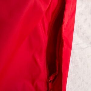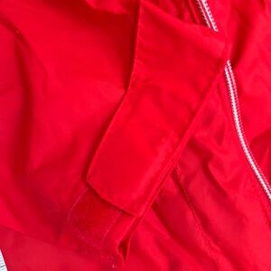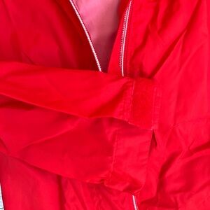 Columbia jacket in a striking red. Features a hood and zip closure.