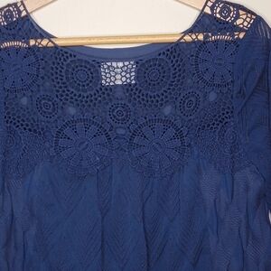 Stunning navy blue dress with crochet upper and textured pattern throughout. Arms are slightly sheer, body is lined.