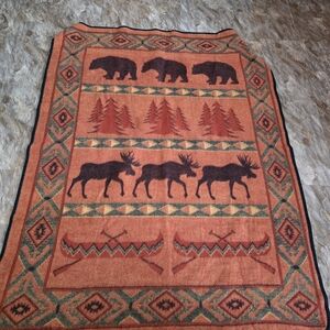 Cozy blanket featuring bears, moose, and canoes. Perfect for a rustic touch. Reversible