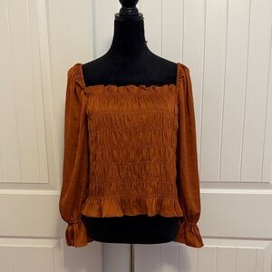 Chic smocked blouse with ruffled details. Long sleeves for elegant style. Ideal for any occasion.