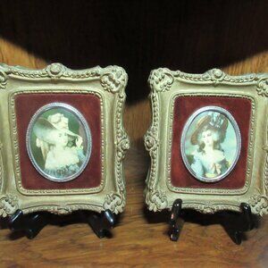 The matching ornate gilded frames feature scrolls and rosebuds, deep burgundy velvet and convex glass covering the glamorous portraits, which are reproductions of women painted in bygone eras. Perfect for adding a touch of elegance to your boudoir or parlour! 🩷