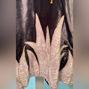 100% silk velvet long sleeve mini dress with beautiful embroidery patterns. This tunic is boxy shape with 2/3 length sleeves. Deep V neck with short collar and tie with bells.