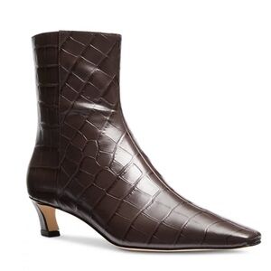 MICHAEL Michael Kors Cosmo Croc Embossed Kitten Heel Boots in Chocolate Brown. Features a sleek square toe and convenient zipper closure. Crafted from croc-embossed leather, they feature a comfortable 1.5" kitten heel that adds subtle height while keeping them easy to wear.