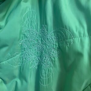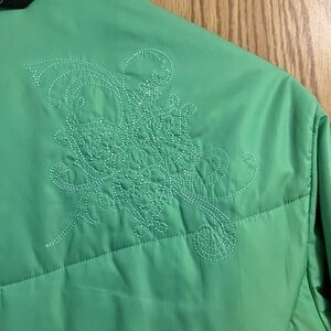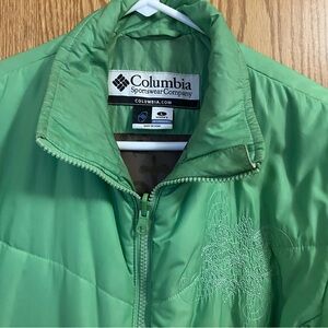 Experience warmth and style with this vibrant green Columbia ski jacket. Ideal for snowy adventures. Women’s size Large puffer jacket with 2 front zip hand pockets with white metallic embroidery on the front and mid back. Poly/nylon blend chest size 42 and length 28”