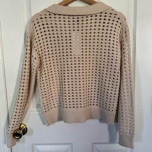 Keywords: neutral knitwear, open weave sweater, pointelle texture, collared pullover, preppy chic, quiet luxury, minimalist style, soft beige, breathable knit, polished casual, elevated basics, layering piece, transitional sweater, modern classic, effortless elegance, neutral aesthetic, lightweight knit, coastal grandmother, timeless wardrobe, contemporary staple