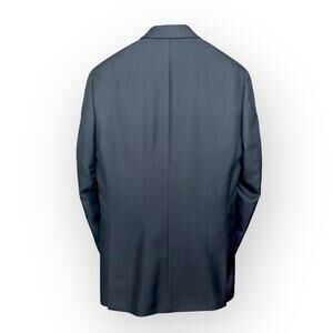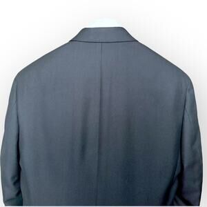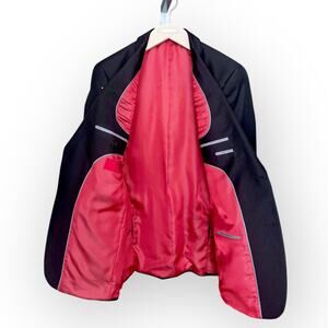 42L Black jacket, 2 Button, Single breasted, double vent at back, flap pockets, fully lined in red lining, hand finished stitching inside all around, Sleeve closed cuff with 4 buttons, ivory stripy lining inside sleeves. Shell- polyester/rayon, lining-polyester.