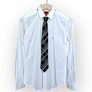 15- 15.5 neck, 34-35 sleeves, white, slim fit shirt, point collar, back yoke, regular cuff. Cotton with stretch.