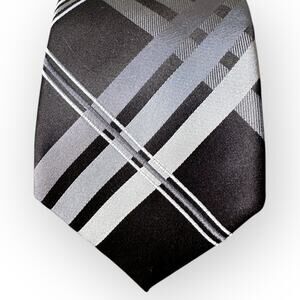 Slim Tie, with lines crossing each other, black and charcoal gray. Feels like silky polyester.