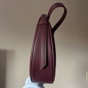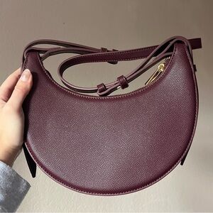JW Pei gorgeous crescent shape burgundy purse made from vegan leather. Features gold hardware & adjustable should strap. Beautiful inside lining as well.