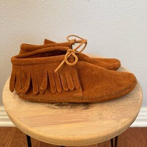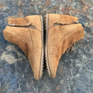 Minnetonka Womens Size 5.5 Dusty Brown Ankle Leather Suede Moccasin Boots Side Fringe