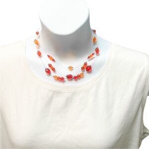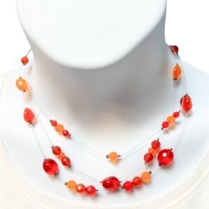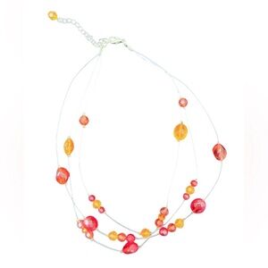 Bright, bold, and beautiful! This multi-strand necklace features vibrant orange and red beads on clear wire, creating a floating, layered look that adds instant color to any outfit. Lightweight and easy to wear—perfect for summer, fall, or anytime you want a pop of fun.